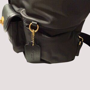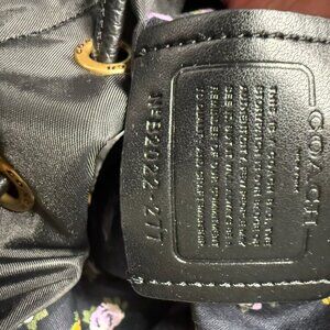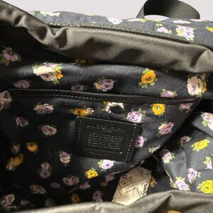 The Coach with Vintage Rose Purse Lining, Nylon Cargo Backpack in Black is a stylish and practical handbag suitable for travel and casual occasions. This medium-sized backpack features a zip, magnetic, buckle, drawstring, and turn lock closure, with a nylon exterior and adjustable shoulder strap for added convenience. The design includes outer and inner pockets, a lined interior with vintage rose pattern, and a brass hardware accent. Perfect for adding a touch of designer flair to your outfit, this Coach backpack exudes a bohemian vibe with a hint of rose-themed detail on the inside.