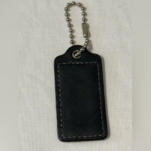 Elevate your style with this Coach black patent leather hangtag/keychain, featuring a sleek rectangular design with a raised border and silver-toned accents.