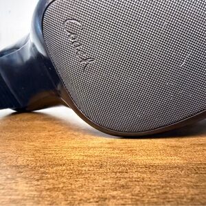 Sleek and timeless Coach pumps in glossy black patent leather. A wardrobe staple, these heels feature a round toe, stacked block heel, and metallic gold lining with embossed Coach branding. Subtle Coach logo etched into the heel adds a polished designer touch.