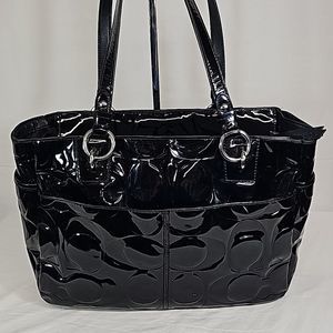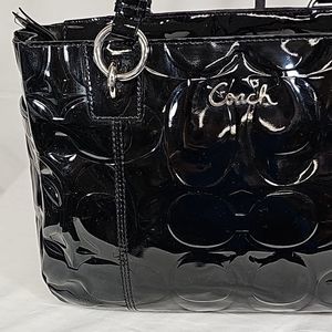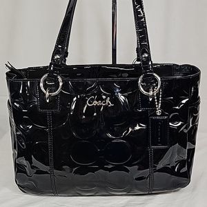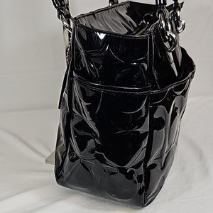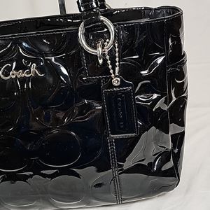Elegant black patent leather satchel. Features signature Coach logo. Stylish and versatile design.