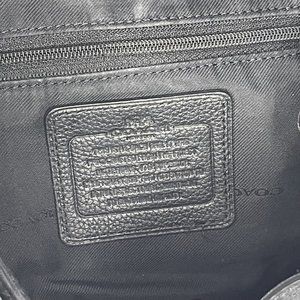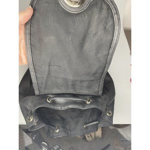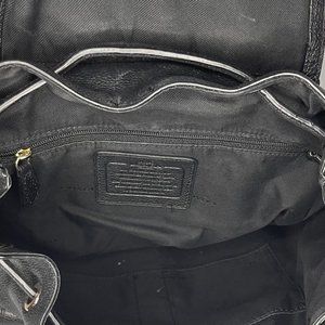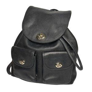 A classic Coach backpack! Minimal wear to inside and out. Turnlock outside double pockets, turnlock top flap, drawstring closure. Lining is black Coach print. Has coach hang tag, silver grommets line outer pockets.