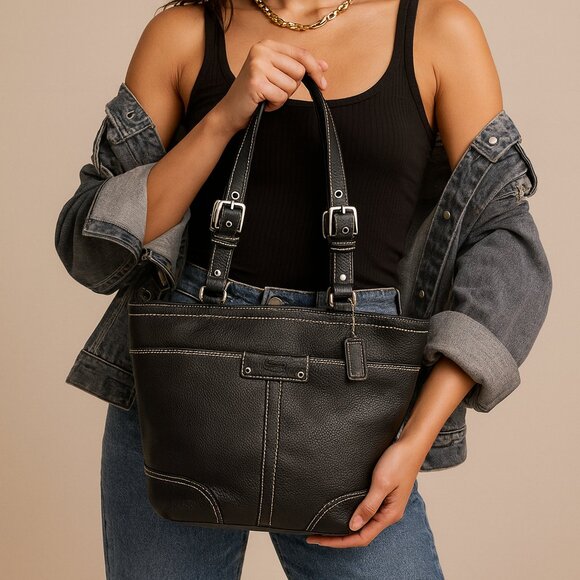 Coach tote, F13089, black leather bag, pebbled leather, buckle straps, silver hardware, shoulder tote, zip top, everyday handbag, classic Coach, women’s leather tote, durable leather.