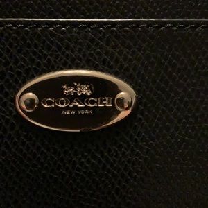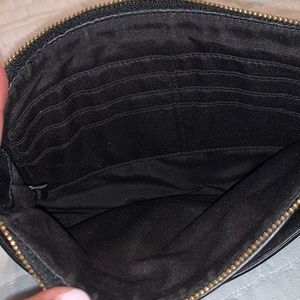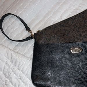 Elegant Coach clutch with a sleek design. Features a black body with a brown zip up pouch. Perfect for any occasion.