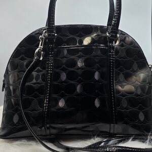 Elegant black satchel with signature pattern. Sleek design with top handles. Perfect for any occasion. Lots of bag space!