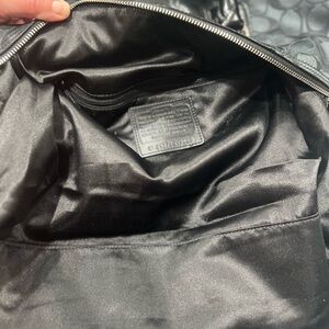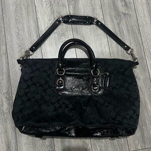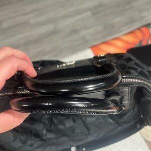 Elegant black Coach satchel with signature design. Features metallic accents. Perfect for any occasion.