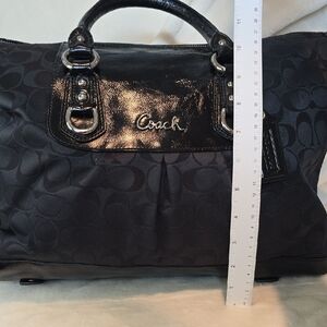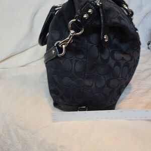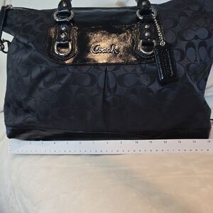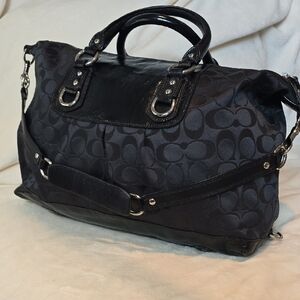 Elegant black satchel with signature Coach design. Features shiny accents and sturdy handles. Perfect for any occasion.