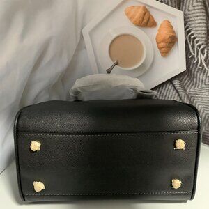 New with the original tag and protective packaging, black leather handbag with gold toned base metal hardware and branded leather tag. The inside has not been touched, why I didn’t include the creed. Measuring approx. (10.25"x 5.5" x 7") with a double strap drop of (4.5") and optional signature design shoulder strap. Original care card included. Great for looking good every day. This is no longer in stores.