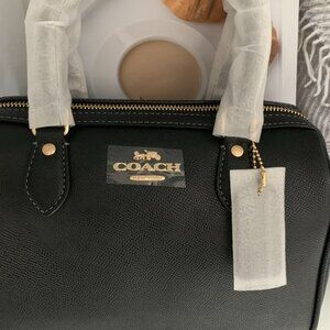 This elegant Coach satchel, crafted in luxurious black leather, features a structured silhouette complemented by gold-tone hardware. Its timeless design and premium materials make it a versatile choice for any occasion, offering both style and sophistication.