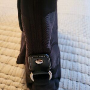 Elegant Coach shoulder bag. Features a front pocket with button closure. Sleek and stylish design.