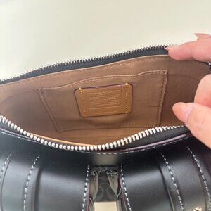 The bag is crafted from classic Coach monogram canvas and black leather for a premium feel. Two symmetrical front flap pockets, secured with a silver square metal buckle, add a touch of vintage chic. A zippered top provides easy access. The adjustable shoulder strap allows for shoulder or crossbody wear. The retro yet practical design complements any outfit and easily accommodates your phone, wallet, and other essentials.