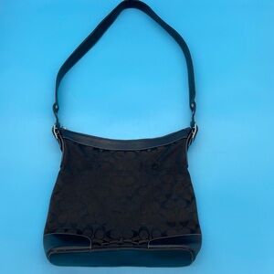 Experience the classic elegance of the Coach Black Shoulder Bag, featuring the iconic monogram pattern. This medium-sized bag is crafted with black leather accents and an adjustable shoulder strap, offering both style and functionality for any occasion.