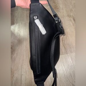 Stylish black belt bag with signature Coach pattern. Features multiple zippered compartments. Perfect for on-the-go.