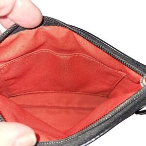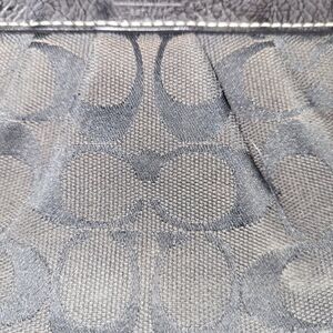 A Signature black “C” jacquard fabric with pebbled black leather trim and silver-tone hardware. Leather wrist strap with Coach hangtag; strap is detachable by lobster clasp. Top zip closure. Lined fuchsia pink interior with small slip pocket.