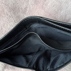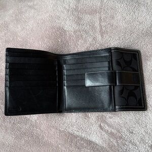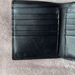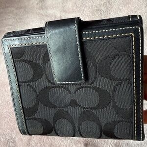 Elegant black wallet by Coach. Features signature canvas and leather trim. Compact and stylish design.