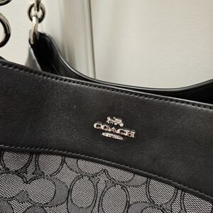Coach Black Signature Canvas and Leather Small Lexy Shoulder Bag. Preowned in good condition, minor wear inside bag from dirt, etc. No holes or major staining. Get style and carry your essentials with ease using this designer shoulder bag. It has been crafted using high-quality materials to be a standout accessory.