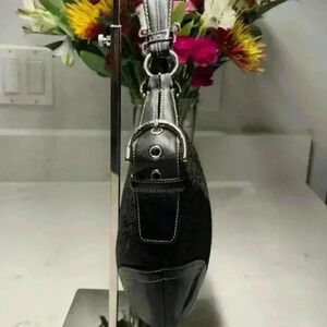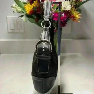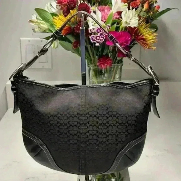 Elegant Coach Signature Hobo Tote Bag with Signature pattern. Features sturdy strap and sleek design.