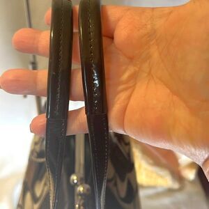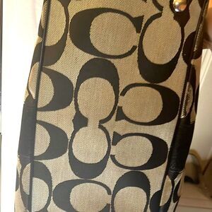 Coach Black Signature Strip Carry All Satchel is in good used condition. One strap has some peeling but strap is not cracked. Please see last two pictures.