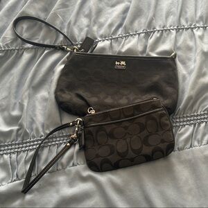 Stylish Coach wristlet duo in black. Features signature pattern. Perfect for essentials.