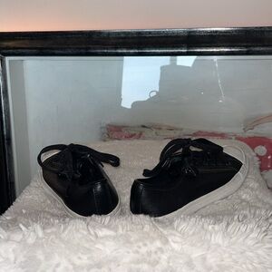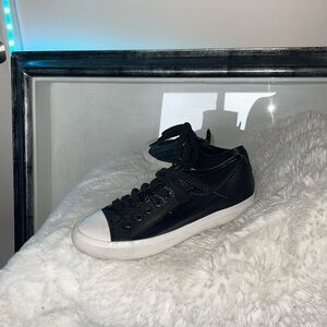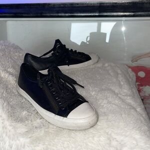 Coach Sleek black sneakers featuring a stylish zipper. Ideal for everyday wear. Genuine leather used a few times the white souls are white nothing I can do tried washing this but did my best in cleaning