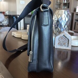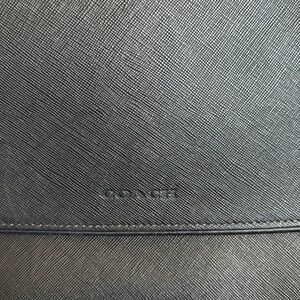 This Coach messenger bag in black leather offers a minimalist design with a flap-over closure and an adjustable shoulder strap. Its structured build and smooth matte finish make it ideal for carrying daily essentials in style.