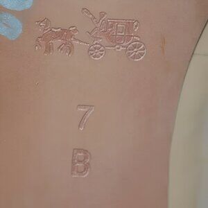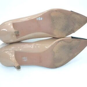 Offered is this lovely classic pair of Coach pumps in neutral nude beige & jet black color block patent leather & gold logo plate. The shoes are in gently pre-owned condition with moderate, average wear including dings to the heels and a few minor shadows to the leather.
