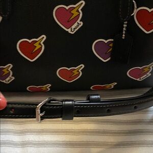 Chic black Coach tote featuring vibrant heart and lightning motifs. Ideal for daily use. Only used once