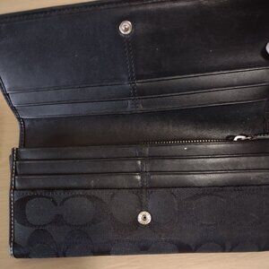 This is a Coach black wallet measuring 8" x 4". It has 1 outside pocket and 8 small inside pockets as well as 4 large inside pockets. One of the large inside pockets has a zipper. It is in very good condition with normal wear.