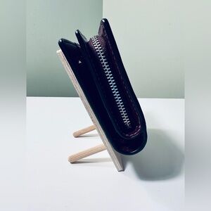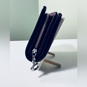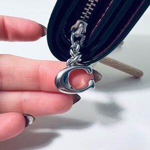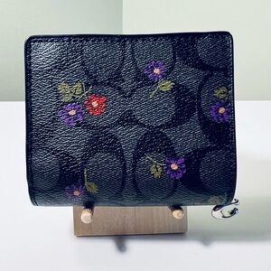 Elegant Coach wallet featuring a black base with vibrant floral accents. Includes purple, red, and green details. Silver Hardware and silver C Charm zipper pull. Excellent used condition.