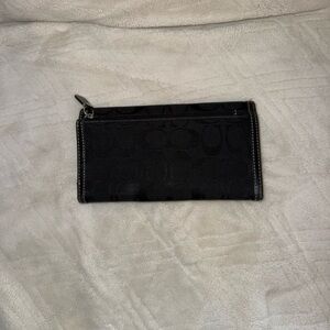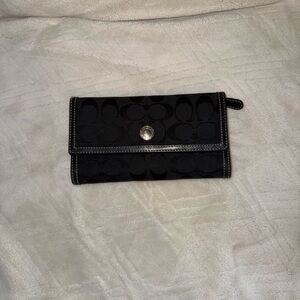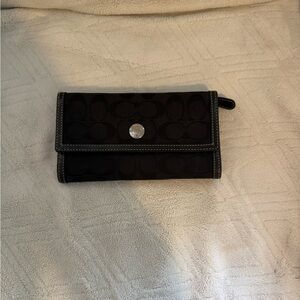 Elegant Coach wallet in black. Features signature pattern and button closure. Has about 15 card slots, multiple cash slots, and a zipper coin pocket on the outside.