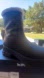 Stylish black winter boots. Features white trim. Durable and comfortable.