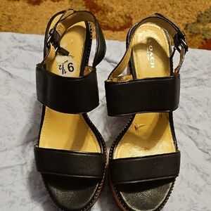 Step out in style with these elegant Coach black platform sandals. Perfect for any occasion, these shoes offer both comfort and sophistication. These shoes are super cute and comfy. Retail was $218. see last two photos that show cracking in the lining that happened when they were in storage. No damage to the outer part of the shoes or the cork heel.