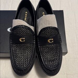 Elegant black loafers with woven design. Features signature Coach emblem. Ideal for stylish comfort.