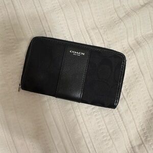 Elegant small black wallet with zip-around closure. Features Coach logo on front. Missing the zipper pull but otherwise it’s in good used condition