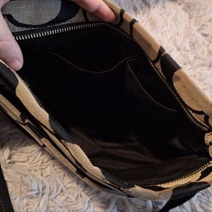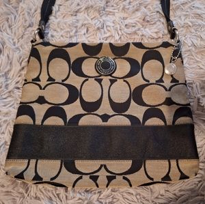 Black and beige coach tote with adjustable strap and sparkle strip around the bottom