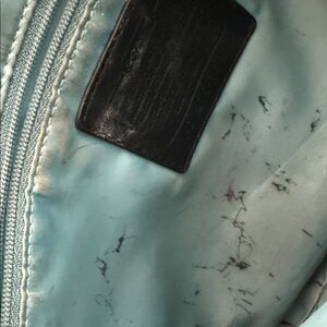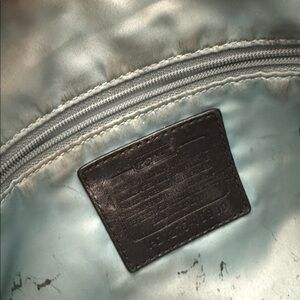 Stylish Coach shoulder bag with signature pattern. Features dual front pockets and metallic accents. Dimensions 12.5” x 9”.
