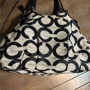 Elegant Coach bag with bold black and cream circles. Features signature Coach emblem.