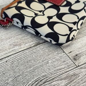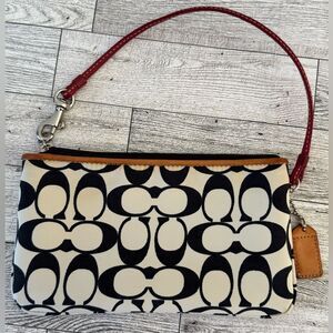 Coach wristlet with creed on outside! Features signature pattern. Red leather accents. Perfect for any occasion.