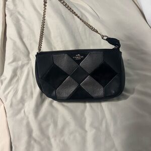 Stylish Coach crossbody bag. Features black and gray geometric design. Chain strap adds elegance.