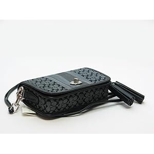 Stylish Coach crossbody bag in black and gray. Features signature pattern and sleek design. Perfect for everyday use.