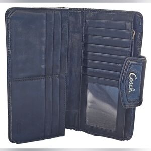 As seen in pictures, their is a tiny spot of rubbing on the exterior edge, inside on the card slots, and a cut in the plastic ID holder at the bottom. This wallet/clutch has 14 card slots, 2 slip pockets, and a zipperd coin pouch. The outside is in great condition. Color may vary due to camera lighting.