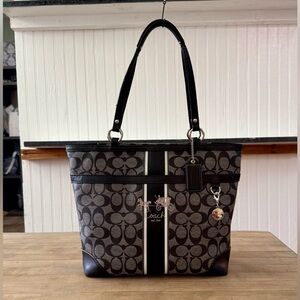 Coach Black and Gray Heritage Stripe Tote Bag Purse with FREE Bag Charm