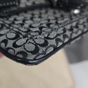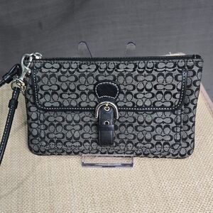 Elegant Coach wristlet with iconic pattern. Features buckle accent and detachable strap.