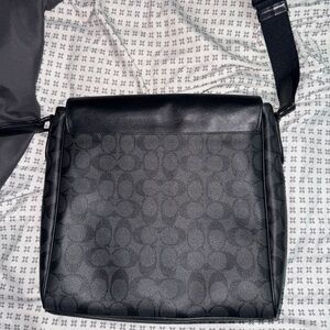 Coach shoulder bag in black and gray. Features a classic logo pattern and adjustable strap.