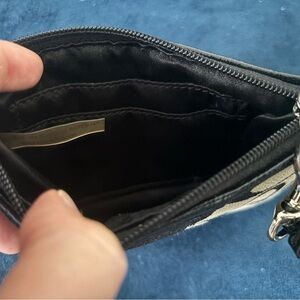 This sophisticated Coach clutch showcases the iconic signature pattern in a sleek black and gray color scheme. Designed for versatility, it effortlessly complements any ensemble while providing a chic way to carry your essentials. The compact design and wristlet feature make it perfect for both casual outings and formal events.