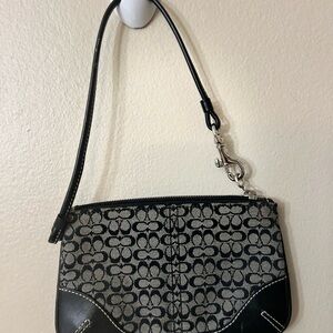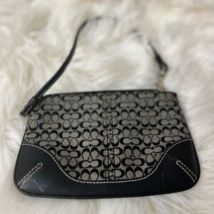 Chic Coach clutch with signature pattern. Black leather accents. Ideal for elegant outings.