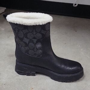 Stylish Coach winter boots. Black leather with gray accents. Cozy and warm for cold weather.