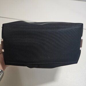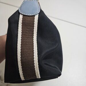 Elegant black wristlet with light blue accent. Features a sturdy handle and secure closure. Perfect for any occasion.