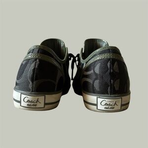 Chic Coach sneakers with a bold pattern. Lace-up style for a secure fit. Chic Coach sneakers with iconic logo pattern. Black and gray tones. Perfect for casual wear.