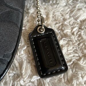 Stylish Coach wristlet. Features black background with purple accents. Perfect for any occasion.