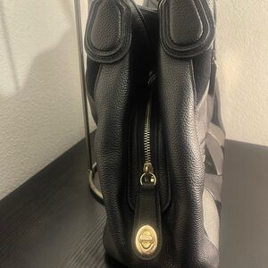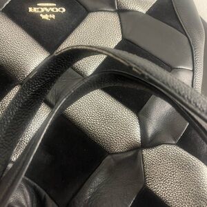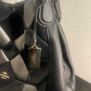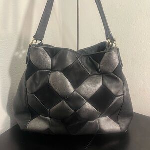 This sophisticated Coach shoulder bag features a striking black and silver geometric pattern, perfect for adding a touch of elegance to any outfit. Crafted with precision, it offers a structured shape and a comfortable shoulder strap for easy carrying. The metallic brand emblem adds a subtle yet stylish detail to this timeless accessory.